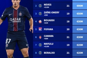 法甲U21球员身价榜:杜埃、若昂-内维斯9000万欧并列榜首