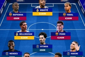 前锋:拉菲尼亚(巴萨,9000万)、姆巴佩(皇马,1.8亿)、亚马尔(巴萨,2亿)